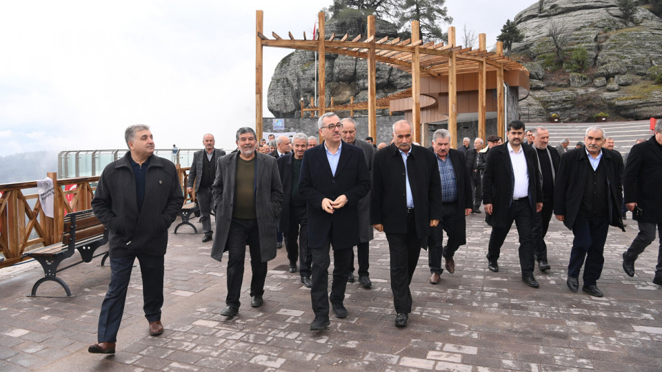 Ali Kayası Cam Teras ve Turizm Tesisleri’nde önceki dönem belde belediye başkanlarıyla bir araya gelen Başkan Güngör, “2023 yılının sonuna doğru Ali Kayası Cam Teras’ı tamamlayarak hizmete açtık. Buraya restoran, ahşap yürüyüş alanları, cam teras ve otopark kazandırdık. Ayrıca buraya ulaşım için standardı oldukça yüksek 20 kilometrelik bağlantı yolu oluşturduk” dedi.
