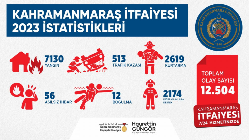 Büyükşehir Belediyesi İtfaiyesi; yangın, kurtarma, boğulma, trafik kazası ve diğer itfai olaylar olmak üzere 2023 yılında 12 bin 504 olaya hızlı ve etkin bir şekilde müdahale etti.
