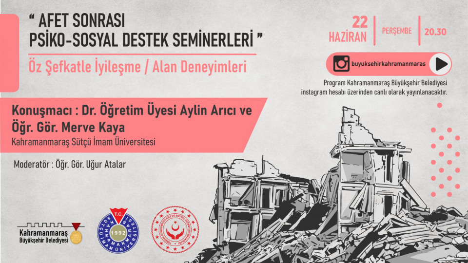 Büyükşehir Belediyesi’nin Afet Sonrası Psiko-Sosyal Destek Seminerleri, 22 Haziran Perşembe günü saat 20.30’da düzenlenecek ‘Öz Şefkatle İyileşme – Alan Deneyimleri’ konulu eğitim semineriyle devam edecek.