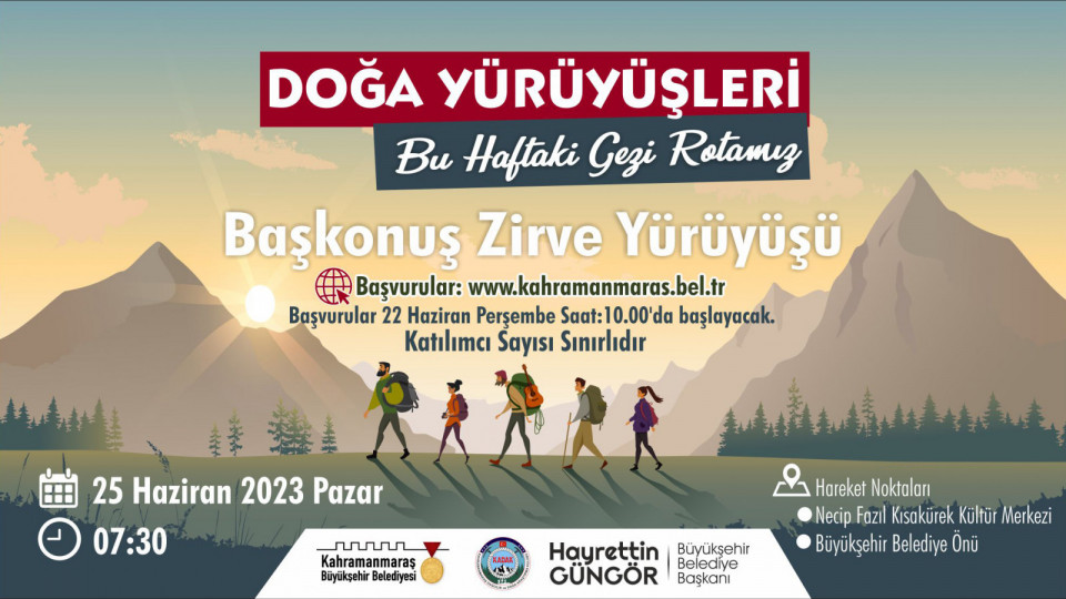 Büyükşehir Belediyesi’nin vatandaşları şehrin doğal güzellikleriyle buluşturduğu ‘Doğa Yürüyüşleri’nin bu haftaki rotası, Başkonuş Yaylası olacak. 25 Haziran Pazar günü gerçekleştirilecek etkinliğe başvurular, Büyükşehir Belediyesi’nin internet adresinden çevrimiçi yapılabiliyor.
