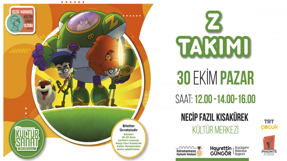 Büyükşehir Belediyesi, TRT Çocuk lisanslı ‘Z Takımı’ adlı müzikal tiyatro gösterisini 30 Ekim Pazar günü miniklerle buluşturacak. NFK Kültür Merkezi’nde gerçekleştirilecek ücretsiz etkinliğe tüm çocuklar davet edildi.