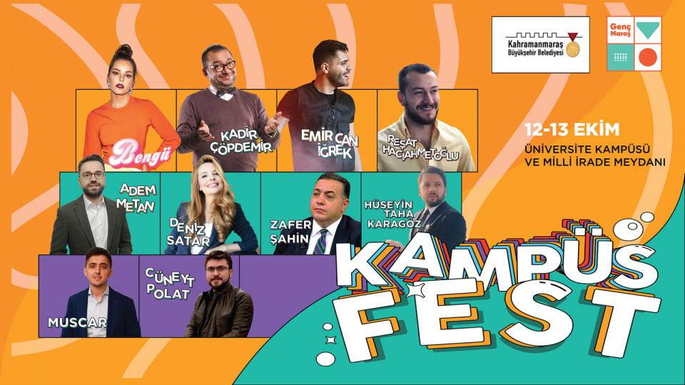 Büyükşehir Belediyesi tarafından 12 – 13 Ekim tarihlerinde Genç Maraş mottosuyla gerçekleştirilecek “Kampüs Fest” adlı gençlik festivalinde birbirinden ünlü isimler Kahramanmaraşlı gençlerle bir araya gelecek.
