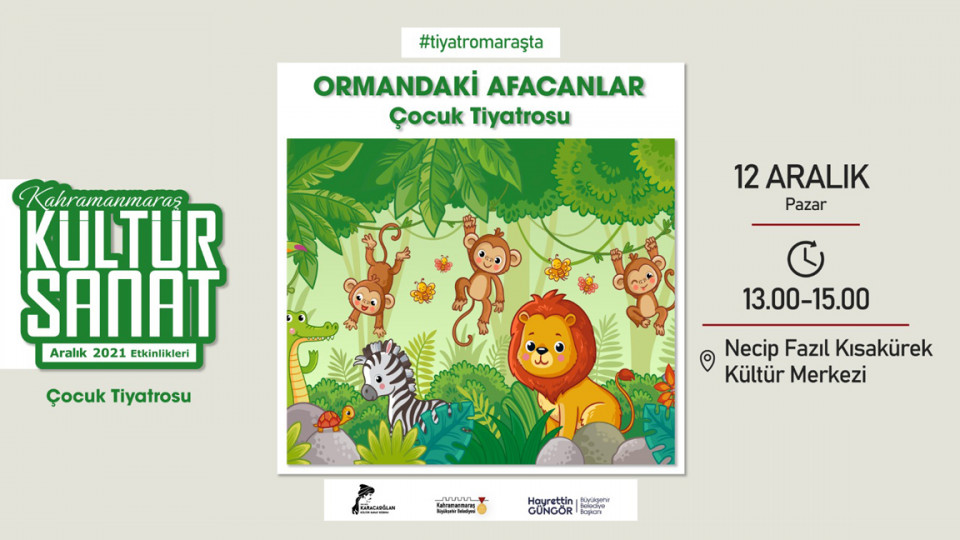 Büyükşehir Belediyesi Aralık Kültür Sanat Etkinlikleri kapsamında 12 Aralık Pazar günü NFK Kültür Merkezi’nde, Ormandaki Afacanlar çocuk tiyatrosu ve Prof. Dr. Uğur Batı İle Buluşma Noktası etkinlikleri düzenlenecek.