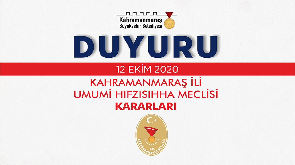 Kahramanmaraş İl Umumi Hıfzıssıhha Meclisi 12 Ekim2020 günü saat 15:30’da Vali Ömer Faruk Coşkun Başkanlığında Valilik Toplantı Salonunda toplanarak aşağıdaki kararları almıştır.