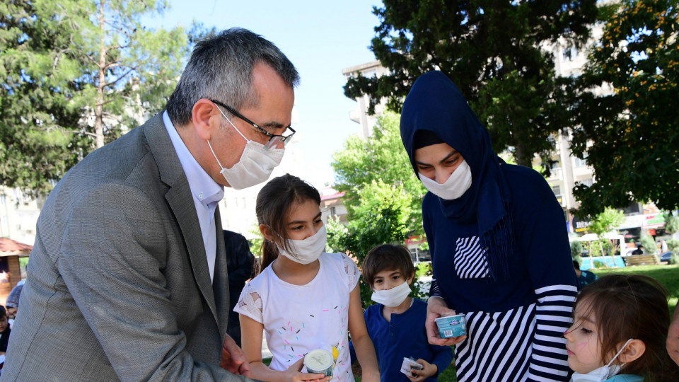 Kahramanmaraş Büyükşehir Belediye Başkanı Hayrettin Güngör, bugün sokağa çıkma izni bulunan 18 yaş altı çocuklara Milli İrade Meydanı’nda dondurma ikram etti.
