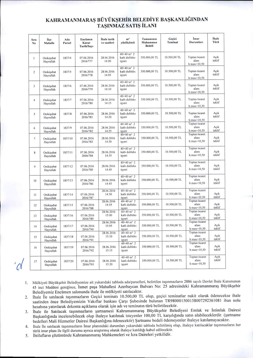 Mülkiyeti Büyükşehir Belediyemize ait İlimiz Merkez Onikişubat İlçesiHayrullah Mahallesi 1857 ada5 nolu parselde (422,35 m²), 12 nolu parselde (422,40 m²),13 nolu parselde (422,42 m²), 14 noluparselde (423,15 m²), 15 noluparselde (422,41 m²) ve 16 nolu parselde (449,58 m²) lik arsaların satışı ilanı...