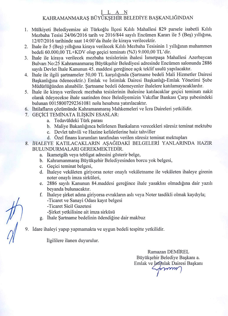 Mülkiyeti Belediyemize ait İlimiz Türkoğlu İlçesi Kılılı Mahallesi 829 parsele isabetli Kılılı MezbahaTesisi2886 sayılı kanun kapsamındakiraya verilmesi ile ilgili ilan...
