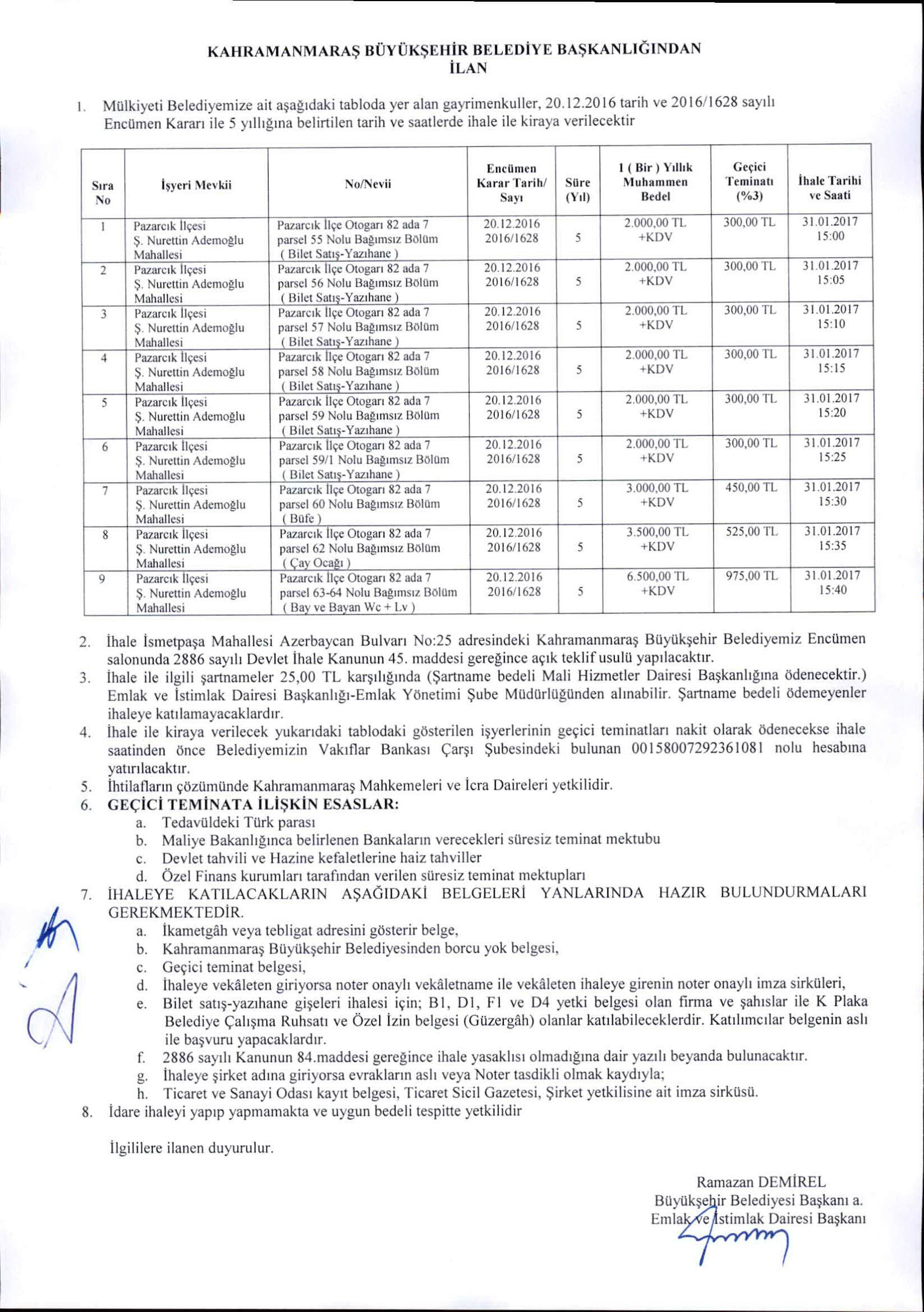 Mülkiyeti Belediyemize ait ekte ilanlarda yer alan gayrimenkuller ihale ile kiraya verilecektir