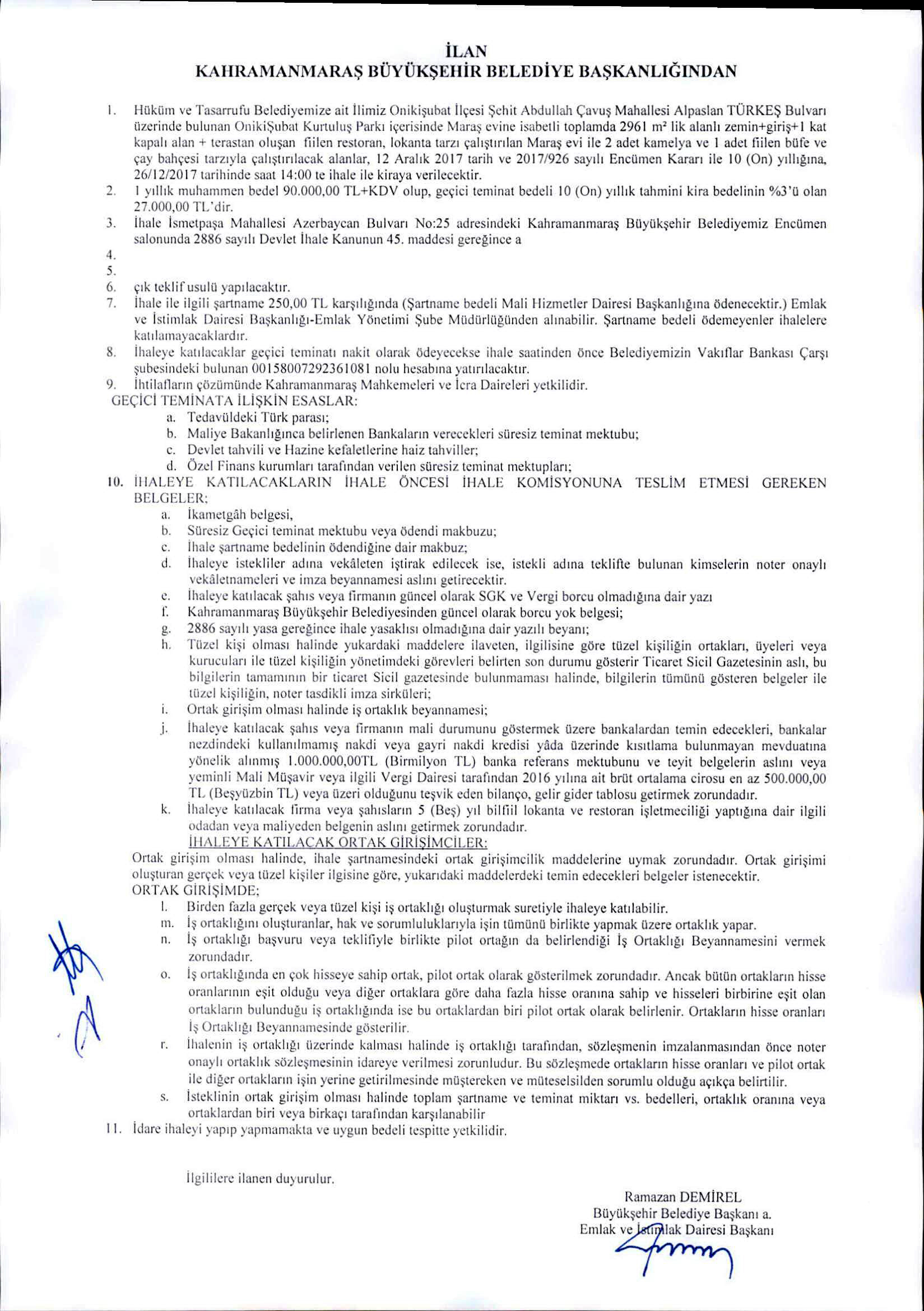 Belediyemiz hüküm ve tasarrufunda olan OnikiŞubat Kurtuluş Parkı içerisinde bulunan ve ilanda belirtilen yerlerin kiraya verilmesi