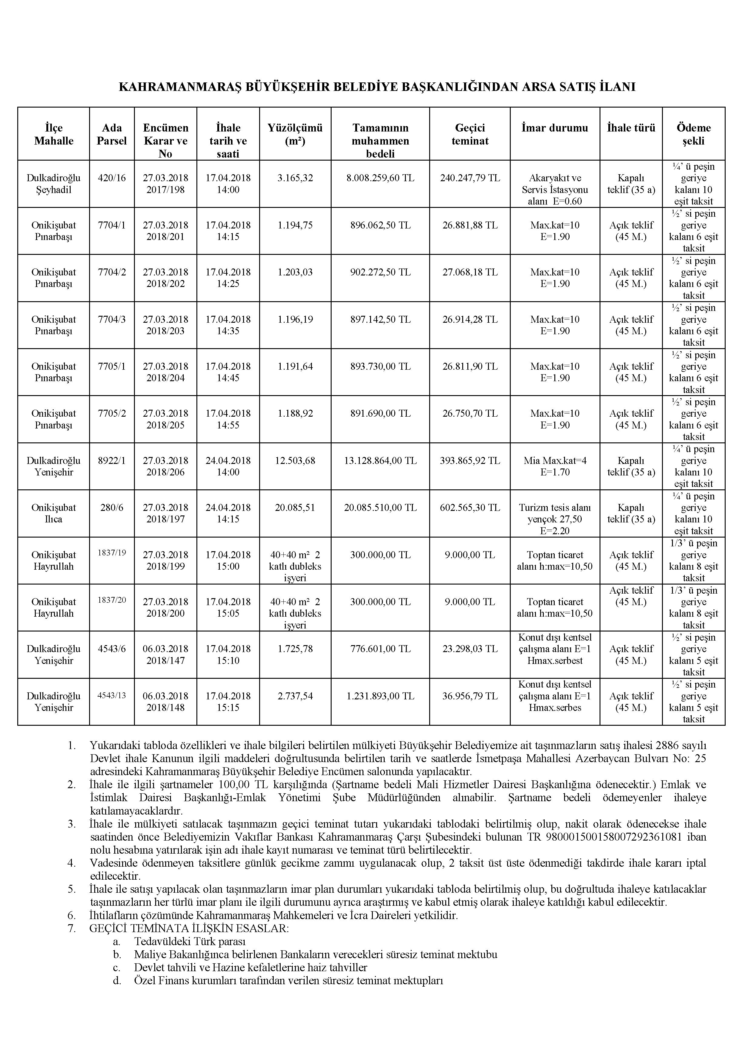 Mülkiyeti Büyükşehir Belediyemize ait muhtelif yerlerde bulunan ekte ilanda yer alan taşınmazların ihale yolu ile satışı