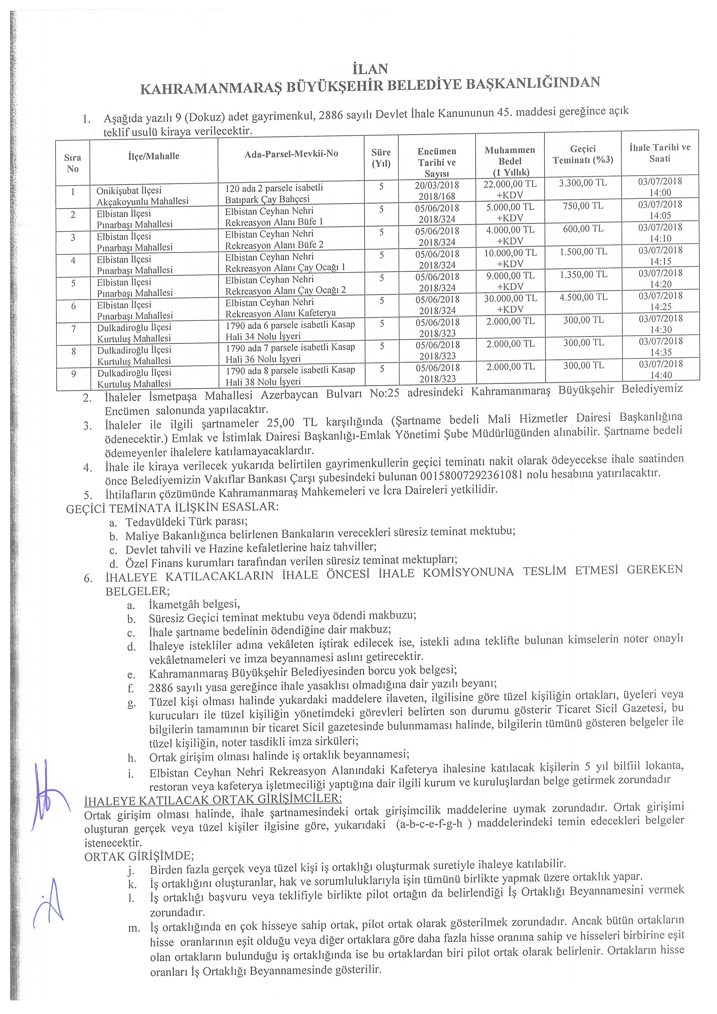 Aşağıda yazılı 9 (Dokuz) adet gayrimenkul, 2886 sayılı Devlet İhale Kanununun 45. maddesi gereğince açık teklif usulü kiraya verilecektir