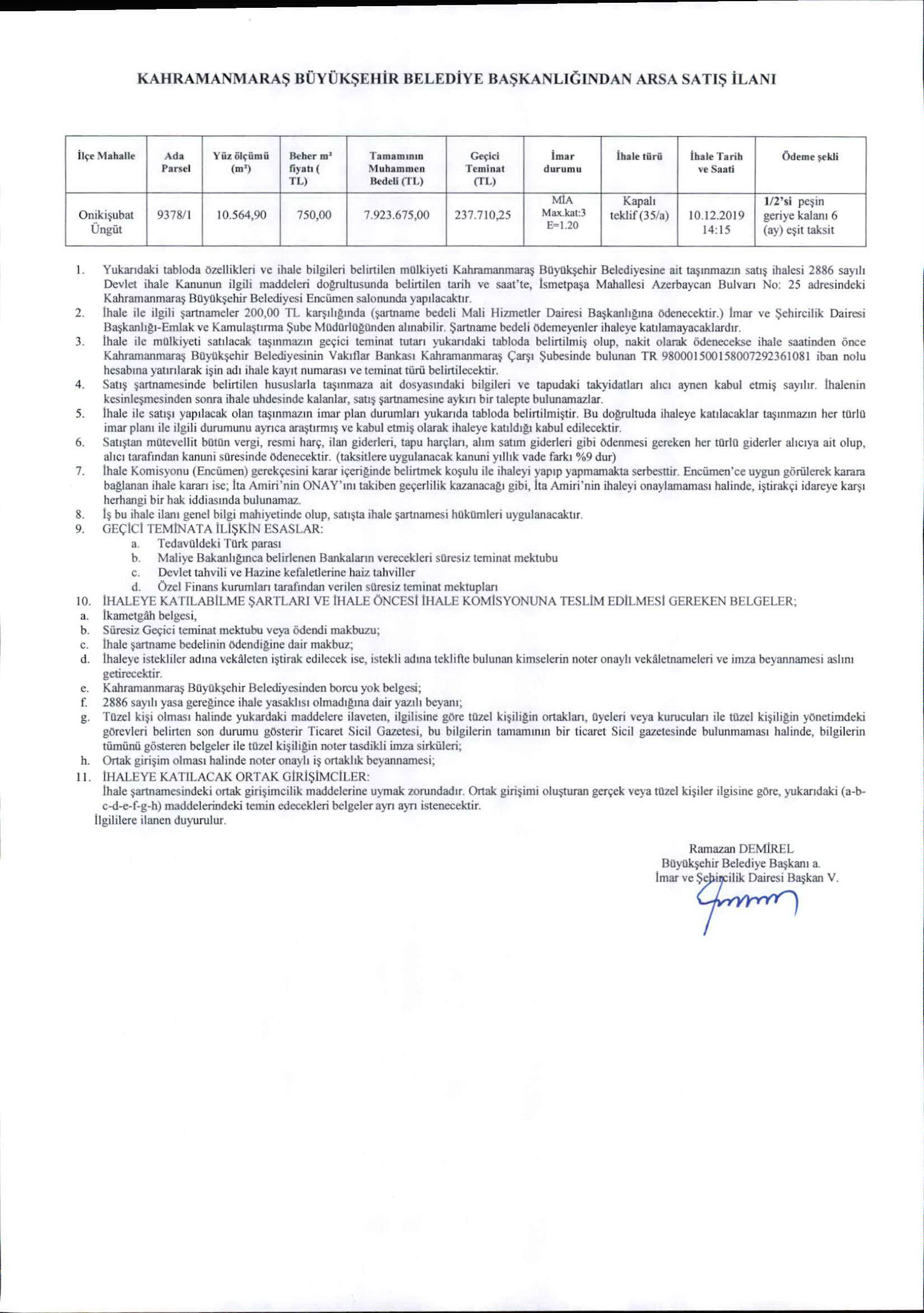 Mülkiyeti Büyükşehir Belediyemize ait ek’li ilanda belirtilen taşınmaz; 2886 sayılı Devlet İhale Kanunun 35 a (kapalı teklif) maddesi doğrultusunda ihale ile satılacaktır