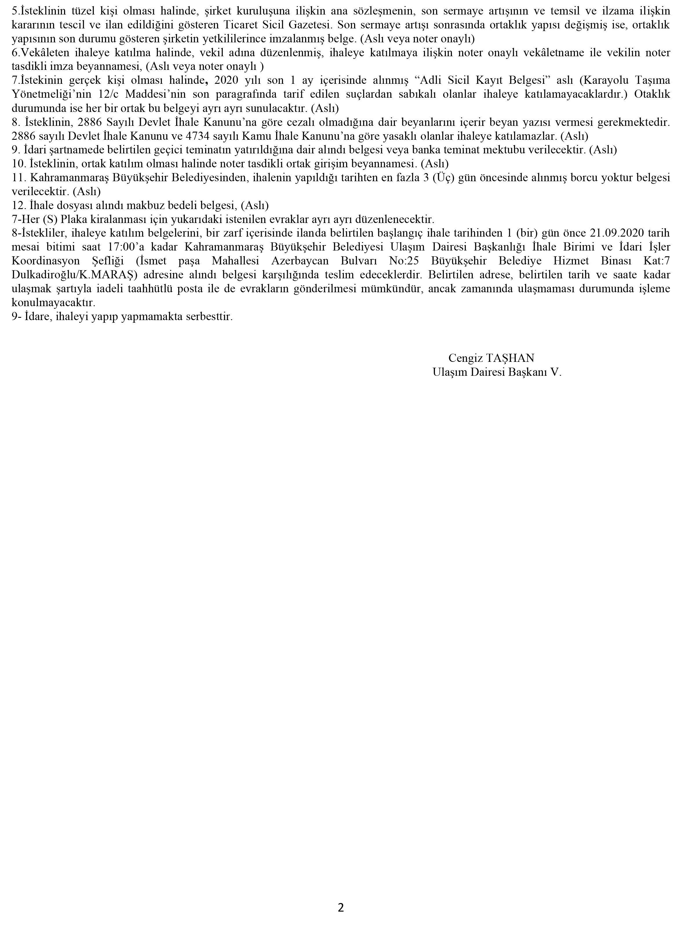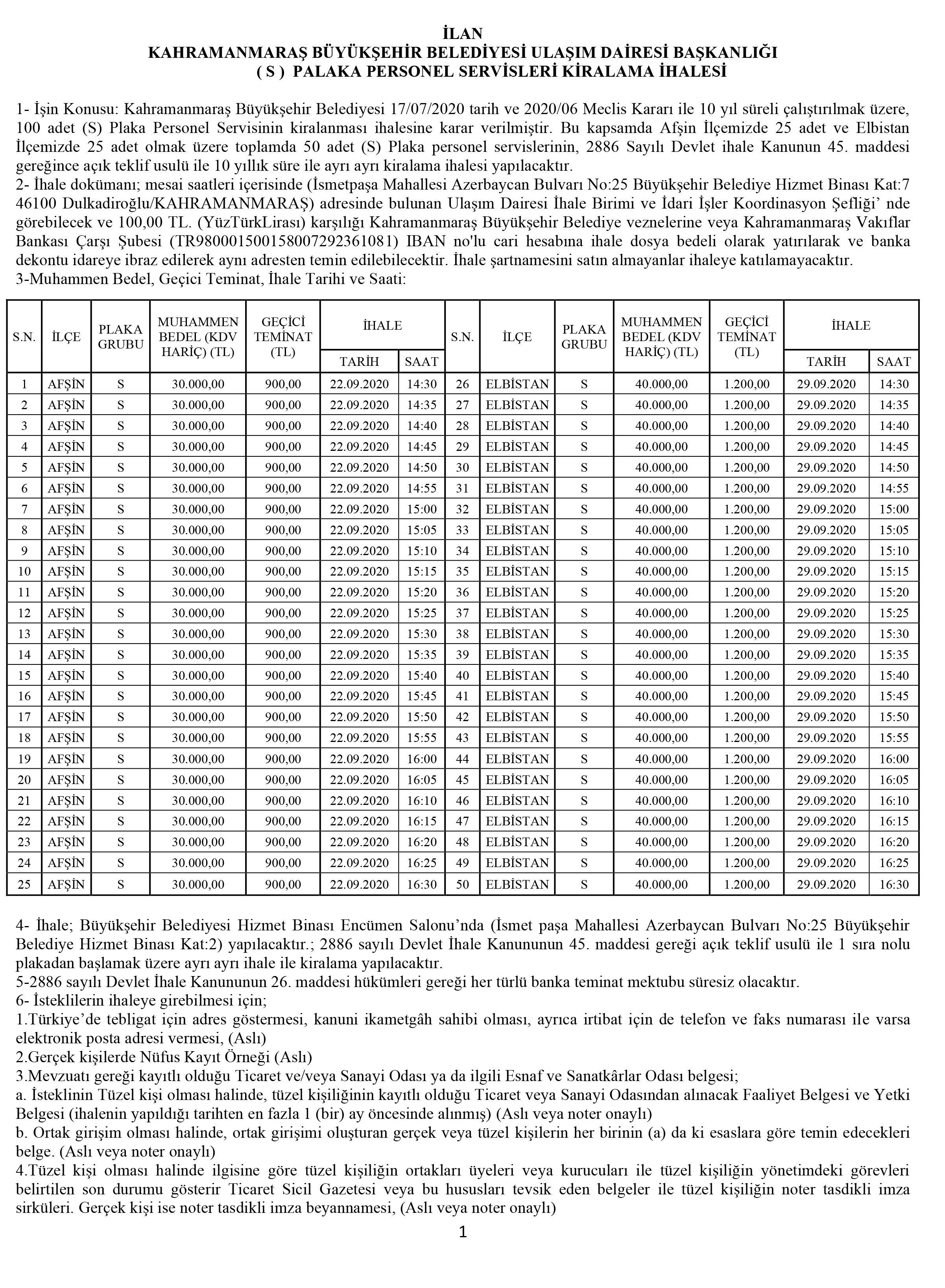 Kahramanmaraş Büyükşehir Belediyesi 17/07/2020 tarih ve 2020/06 Meclis Kararı ile 10 yıl süreli çalıştırılmak üzere, 100 adet (S) Plaka Personel Servisinin kiralanması ihalesi