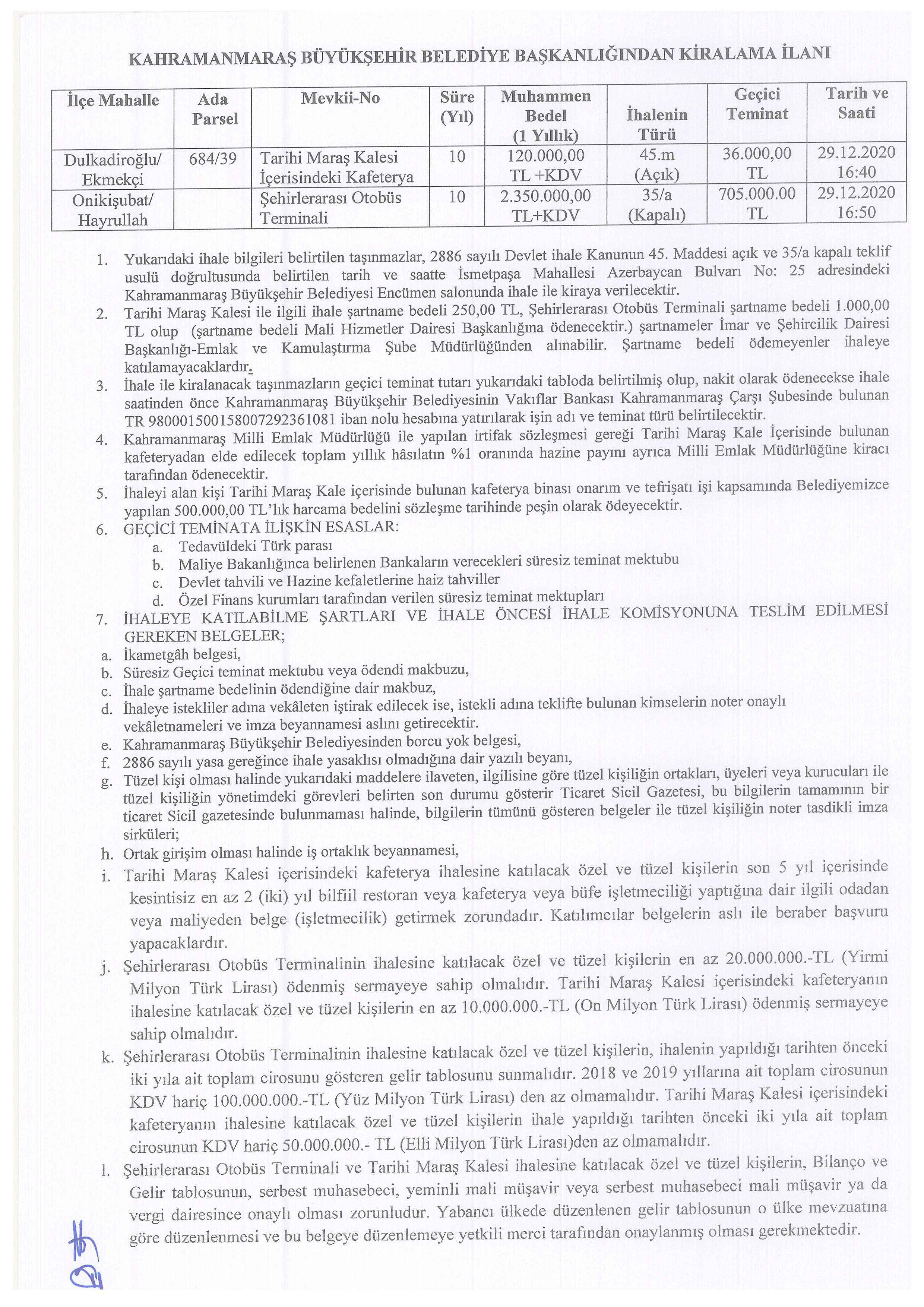 Kahramanmaraş Büyükşehirbelediyesine ait Taşınmaz Mal İhalesi