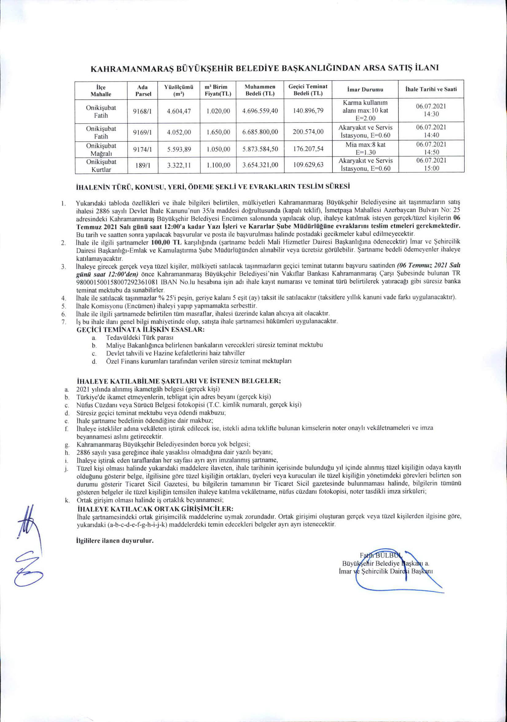 Büyükşehir Belediyemize ait ek’li ilanda belirtilen taşınmazlar; 2886 sayılı Devlet İhale Kanunun 35/a (kapalı teklif) maddesi doğrultusunda ihale ile satılacaktır.