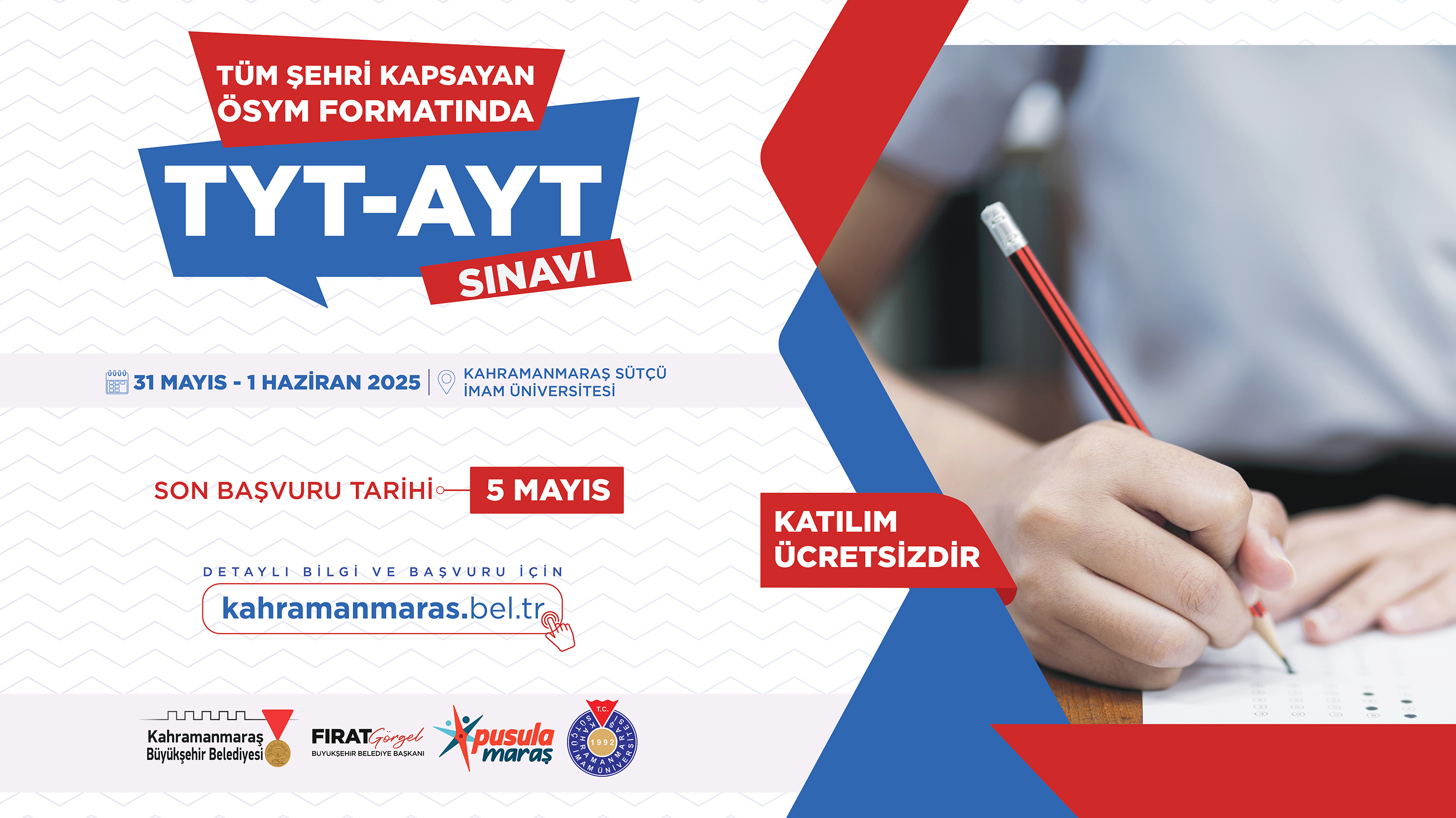 Büyükşehir Belediyesi, üniversite adaylarına yönelik ücretsiz YKS deneme sınavı düzenleyecek. Tamamen gerçek sınav formatında düzenlenecek deneme sınavına başvurular Büyükşehir’in internet adresinden çevrimiçi yapılabiliyor.