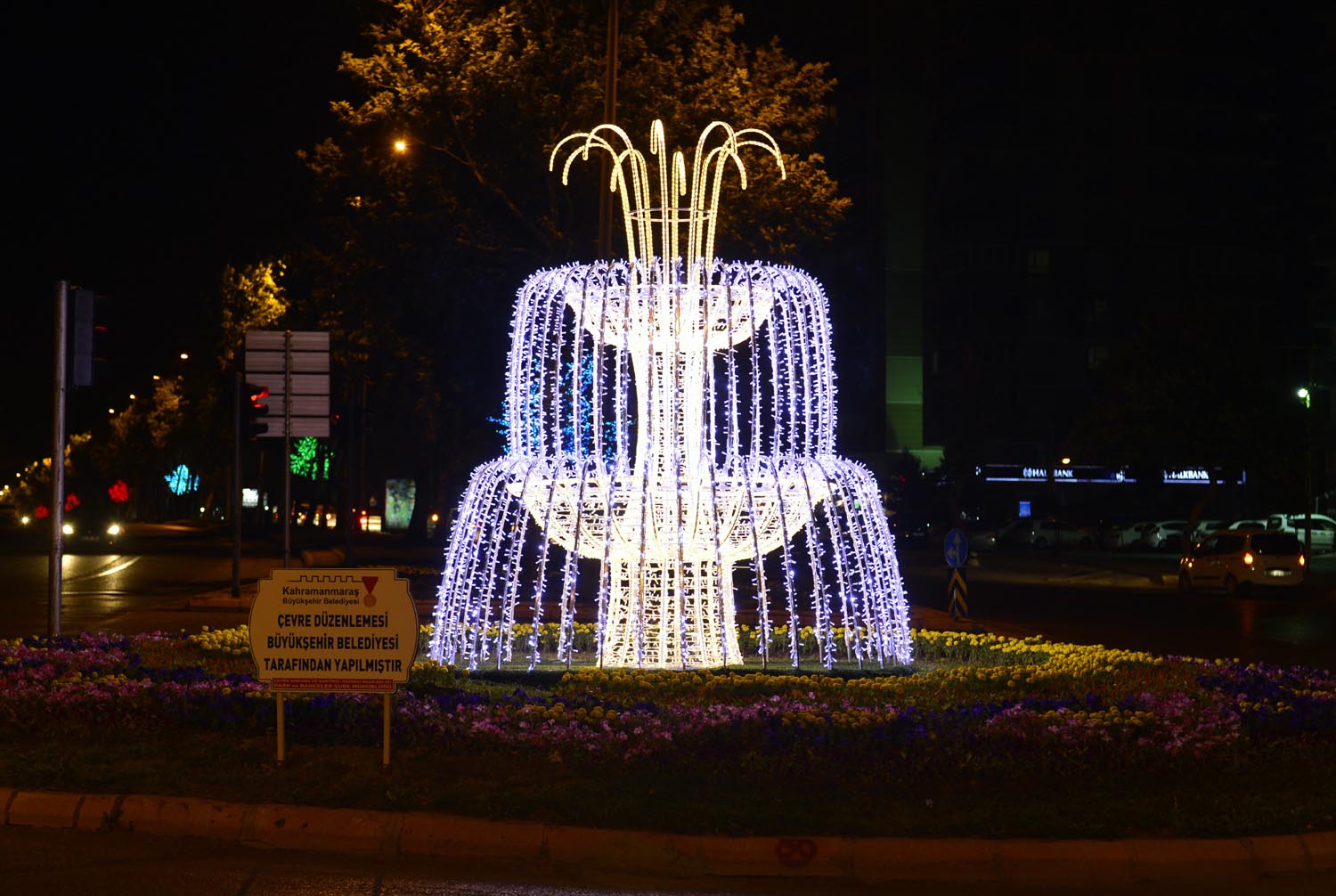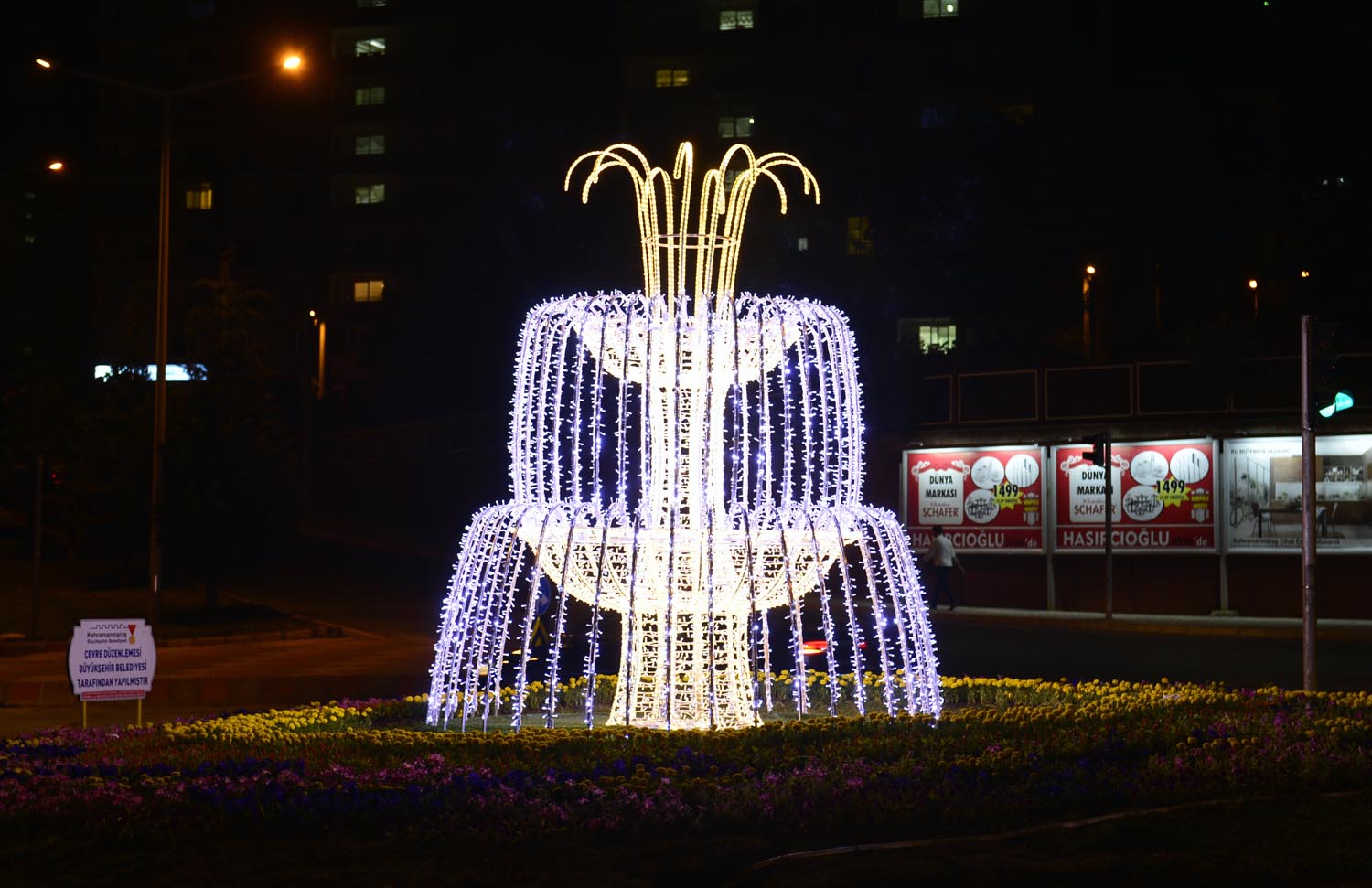 Dr. Mustafa Meydanı’nda kavşakta yer alan dekoratif led süslemeli İstiklal Madalyası ve Alparslan Türkeş Bulvarı-Hanefi Mahçiçek Bulvarı arasındaki kavşakta dekoratif led süsleme fıskiyeli havuz projesi.