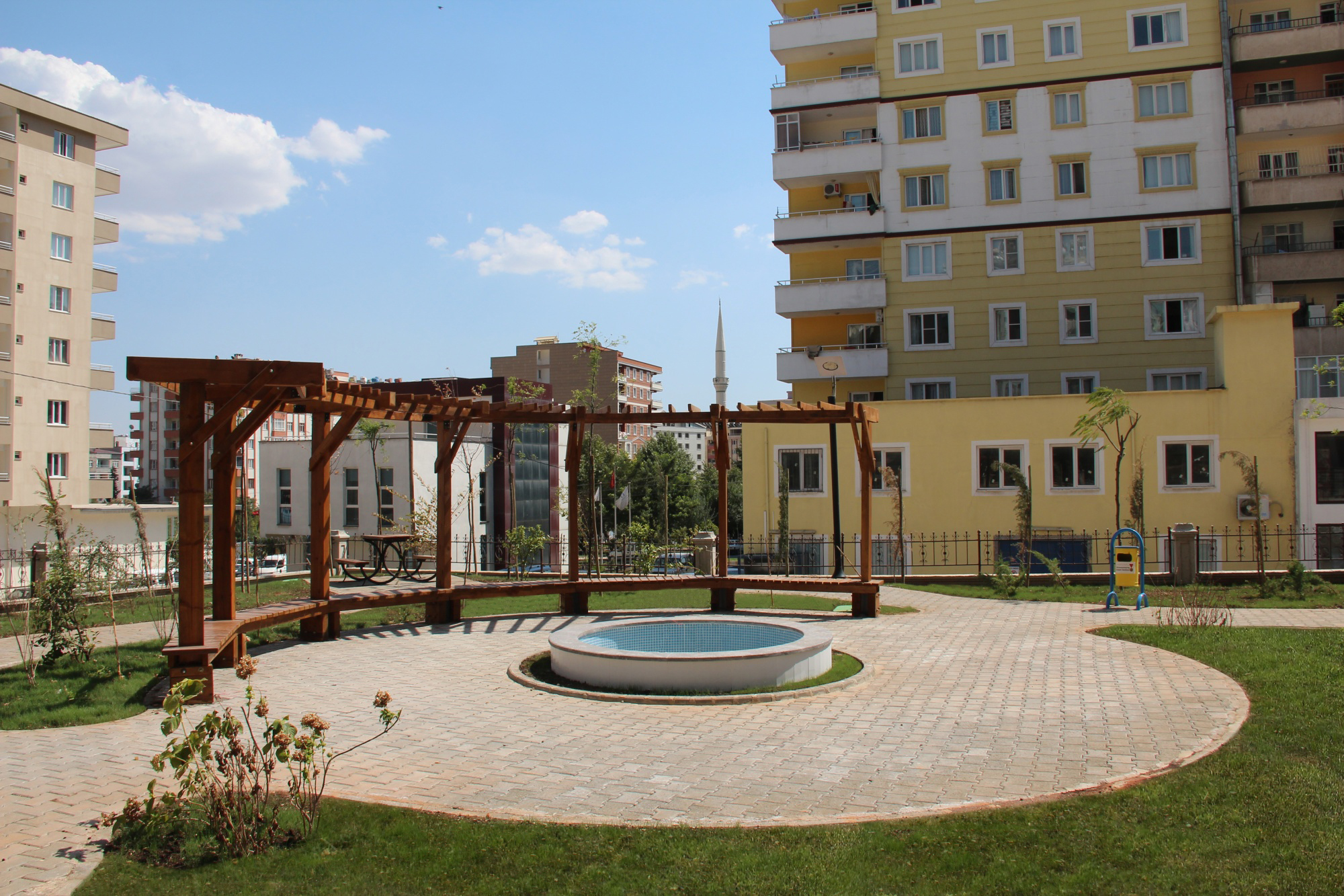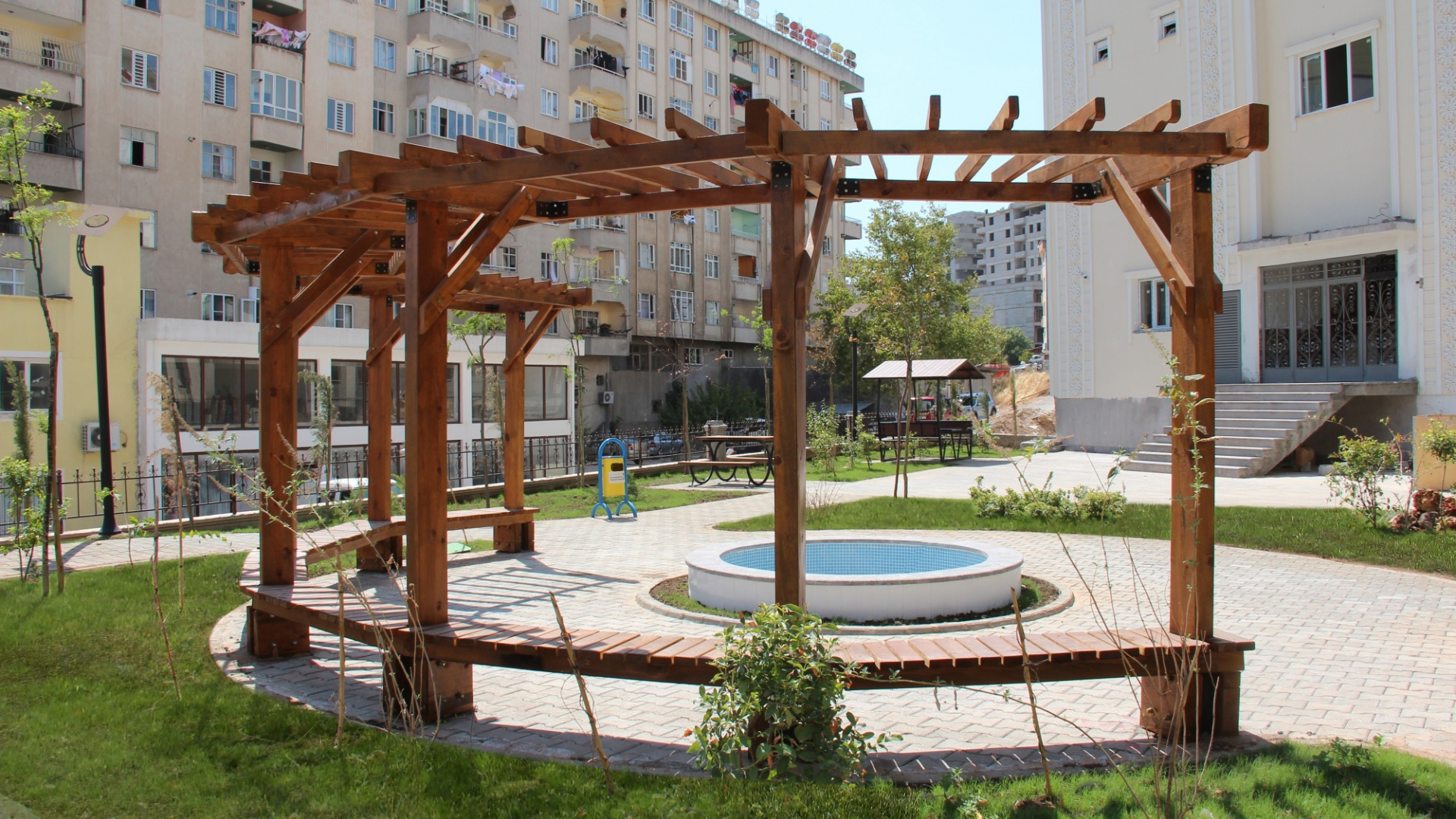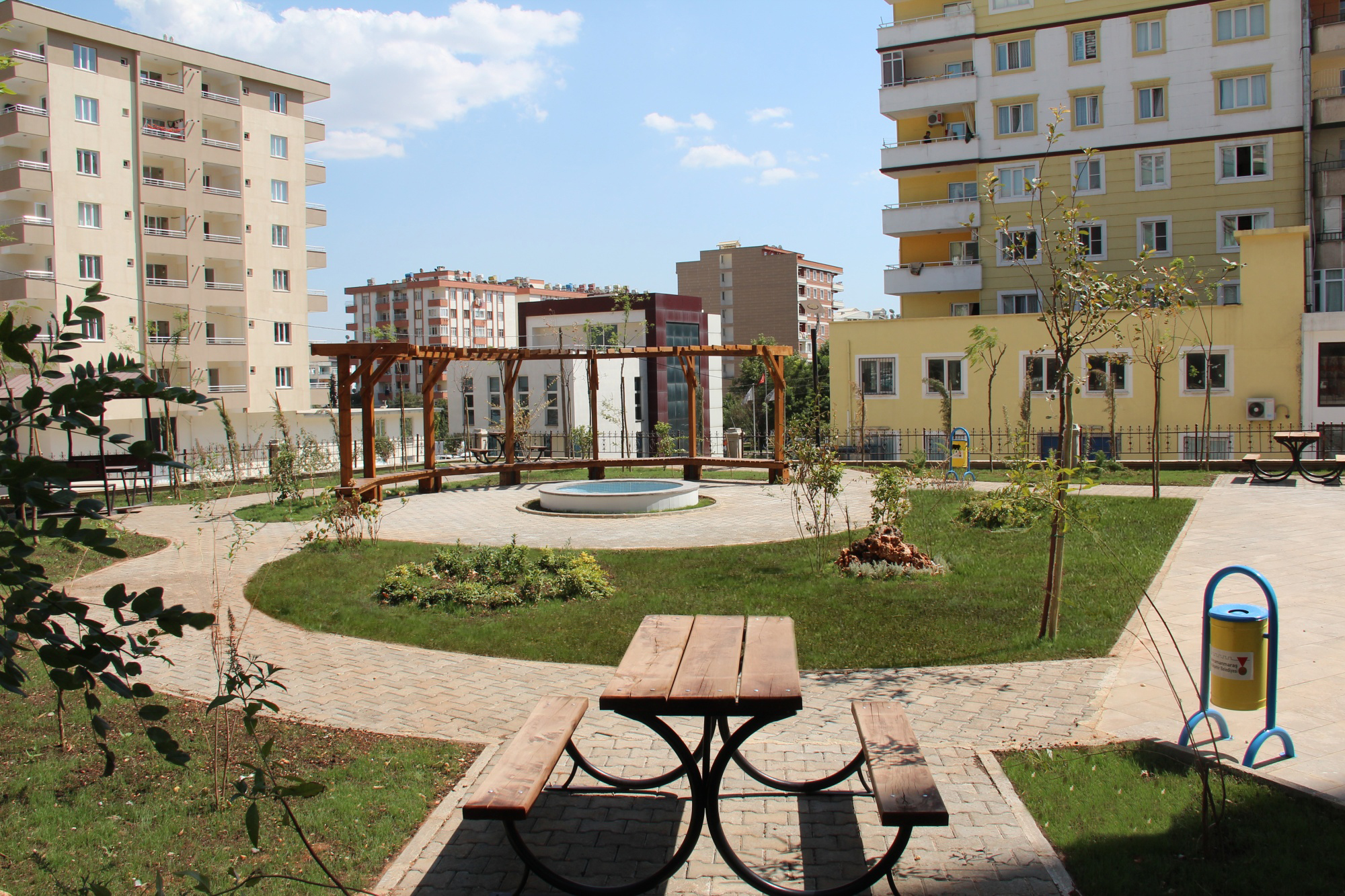 Bahçe düzenleme çalışması kapsamında oturma birimleri, yürüyüş yolu, süs havuzu, pergele ve yeşil alan çalışmaları tamamlanmıştır.
