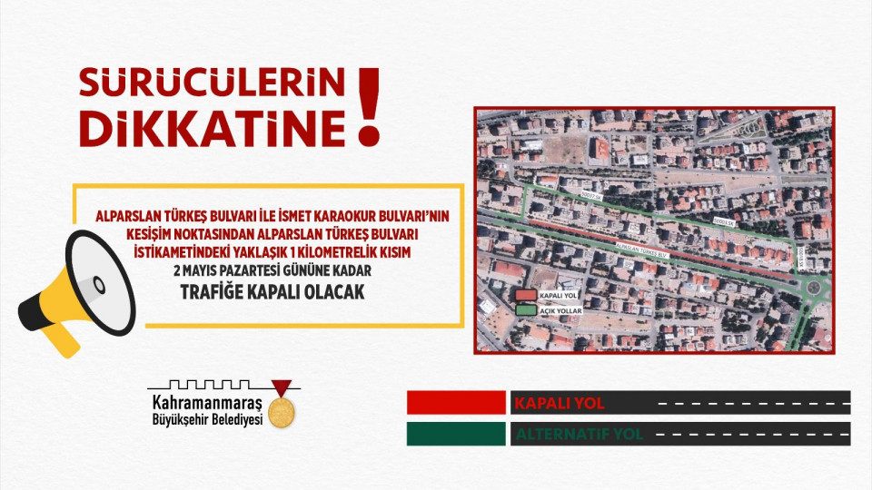 Büyükşehir Belediyesi, gerçekleştirilen altyapı çalışmaları dolayısıyla Alparslan Türkeş Bulvarı ile İsmet Karaokur Bulvarı’nın kesişim noktasında bulunan kavşaktan itibaren Alparslan Türkeş Bulvarı istikametindeki yaklaşık 1 kilometrelik kısmın 2 Mayıs Pazartesi gününe kadar trafiğe kapalı olacağını duyurdu. Sürücülerden alternatif güzergâhları kullanmaları istendi.